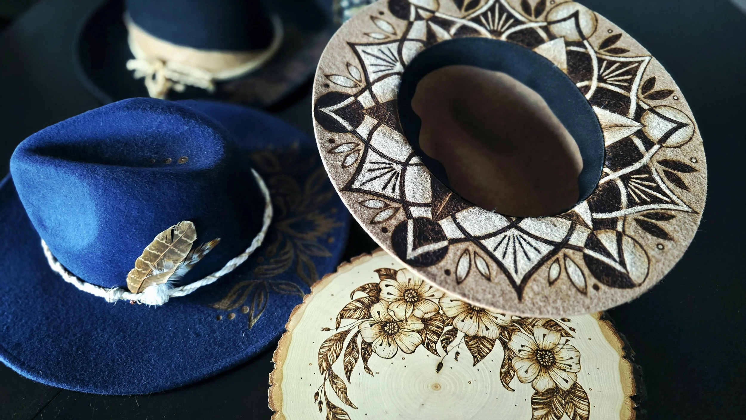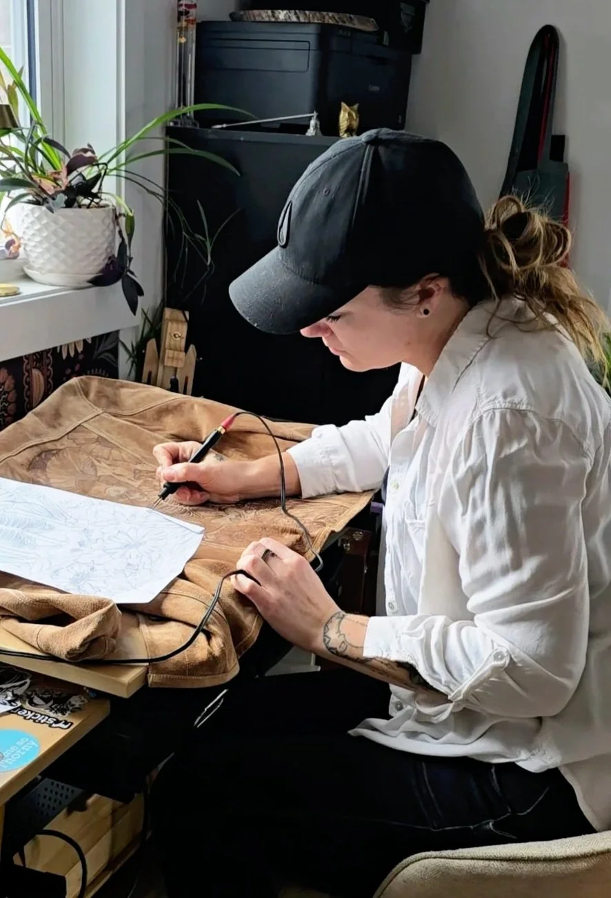 It’s not fast. It’s not perfect. That’s the point. Each mark is permanent, intentional and alive. The burn is then sealed in for longevity so your hat can live life with you (please remember, it is still art).